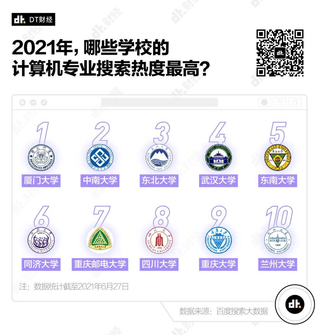 从搜索结果来看,厦大、中南大学、东北大学、武大等学校的计算机专业,搜索热度是最高的。似乎在风景出众的校园里,更能够体会到敲代码的快乐。