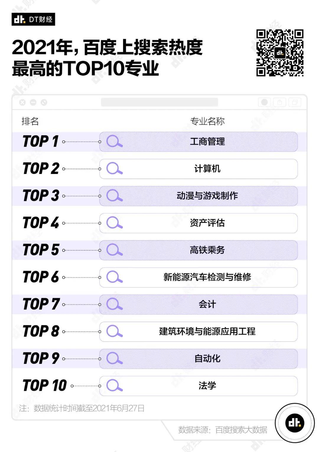 除了选择学校,也有人冲着专业填报志愿。今年搜索热度最高的TOP10专业中,除了工商管理、计算机、会计、自动化等传统强势学科外,还有动漫与游戏制作、高铁乘务、新能源汽车检测与维修这些专业。