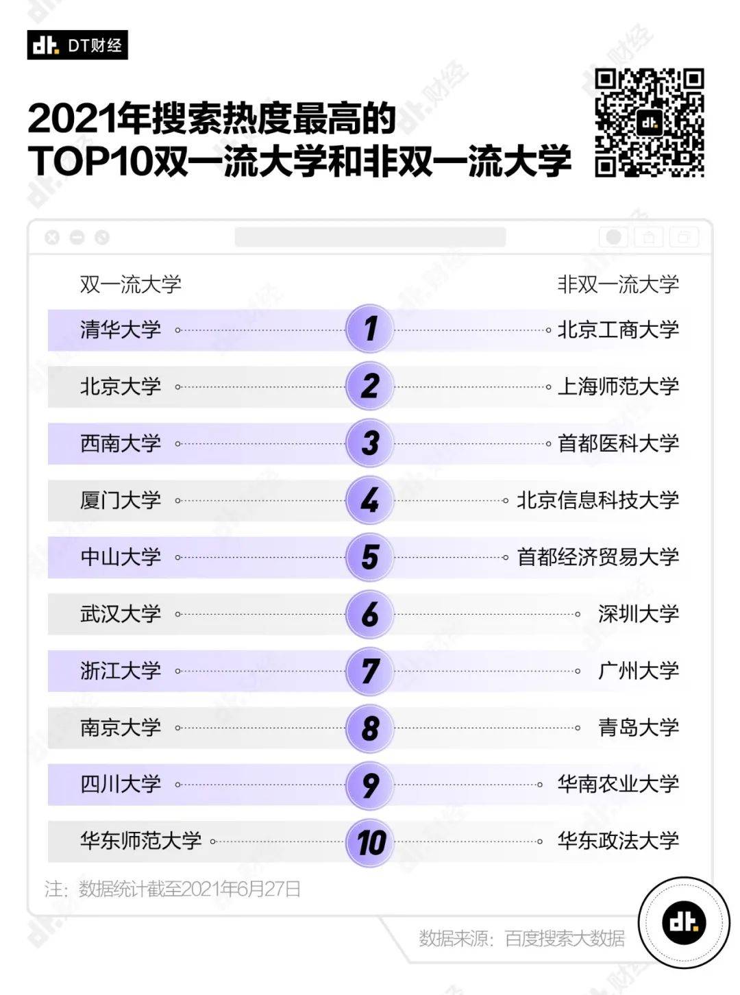 2021年,搜索热度最高的双一流学校,仍然是那几所。但比较让人意外的是,“清北”在榜的情况下,“复交”却在TOP10中不见踪影。