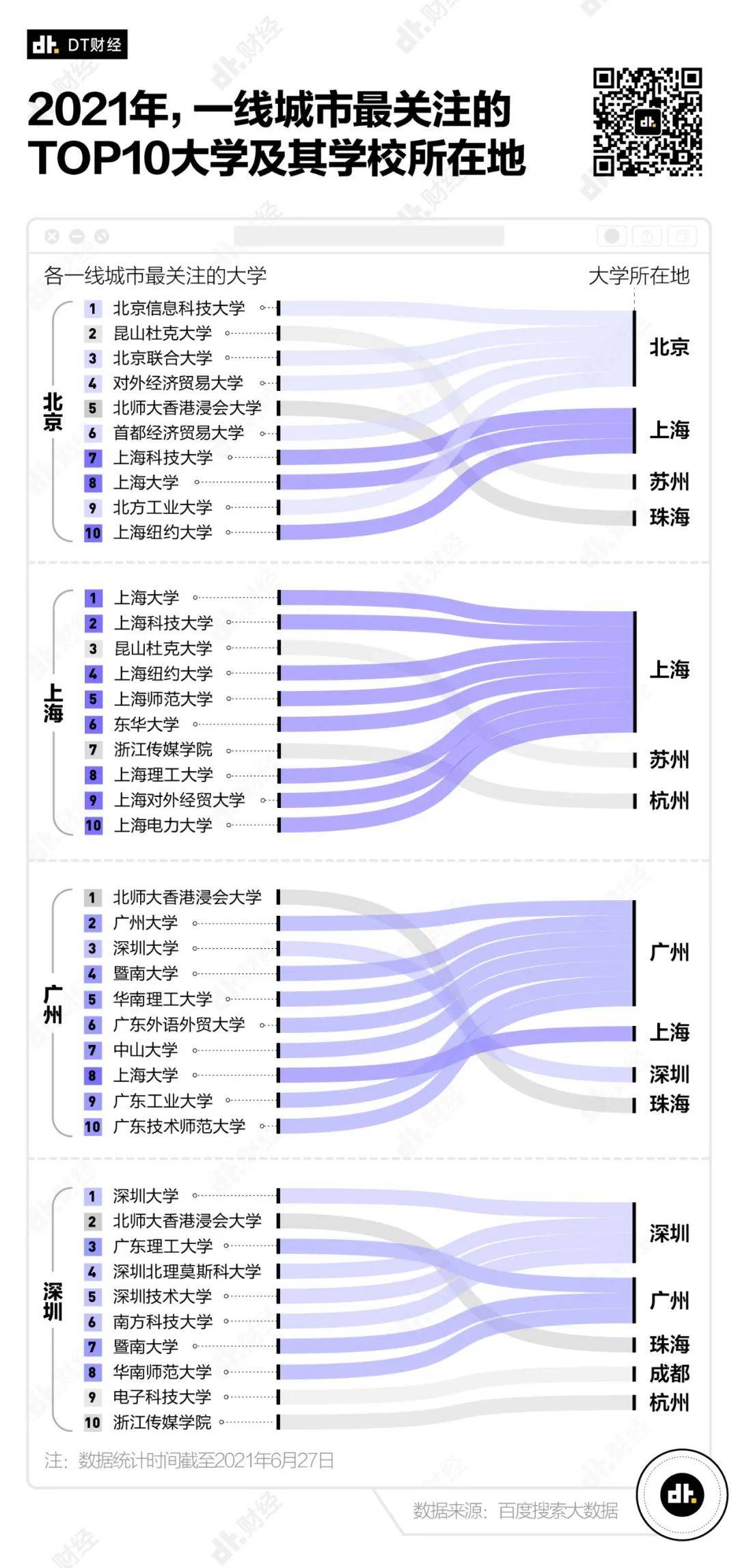 从学校来看,位于珠海的北师大-香港浸会大学,同时出现在了北京、广州、深圳搜索次数最多的学校中,似乎成了一线城市学生心目中的网红大学。