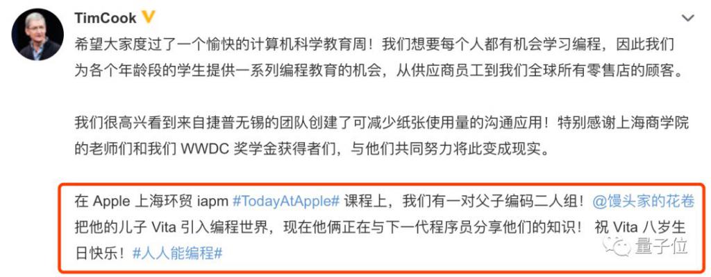 这位引起苹果 CEO 库克发了生日祝福、在 B 站上让 90 后、00 后自叹不如的小朋友,姓甚名谁还被专门保护,江湖代号——Vita 君,刚刚过完 8 岁生日,正在读小学二年级。