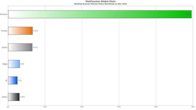 从这份统计数据来看,Google 推出的 Chrome 依然维持着全球第一市场份额的优势,而且其优势差距非常大,在全球的市场份额达到 69.45%。目前 Chrome 已经覆盖 Windows、OS X、Linux、Android 以及 iOS 等多重终端版本,同时面向全球多个国家提供 50 种语言版本,基于 WebKit 等内核打造的这款网页浏览器在响应速度方面处于非常领先的位置,同时 Google 还在 2018 年 12 月决定移除持续提供滥用使用体验的网站上的所有广告,这一决定也获得多数用户得一致好评。