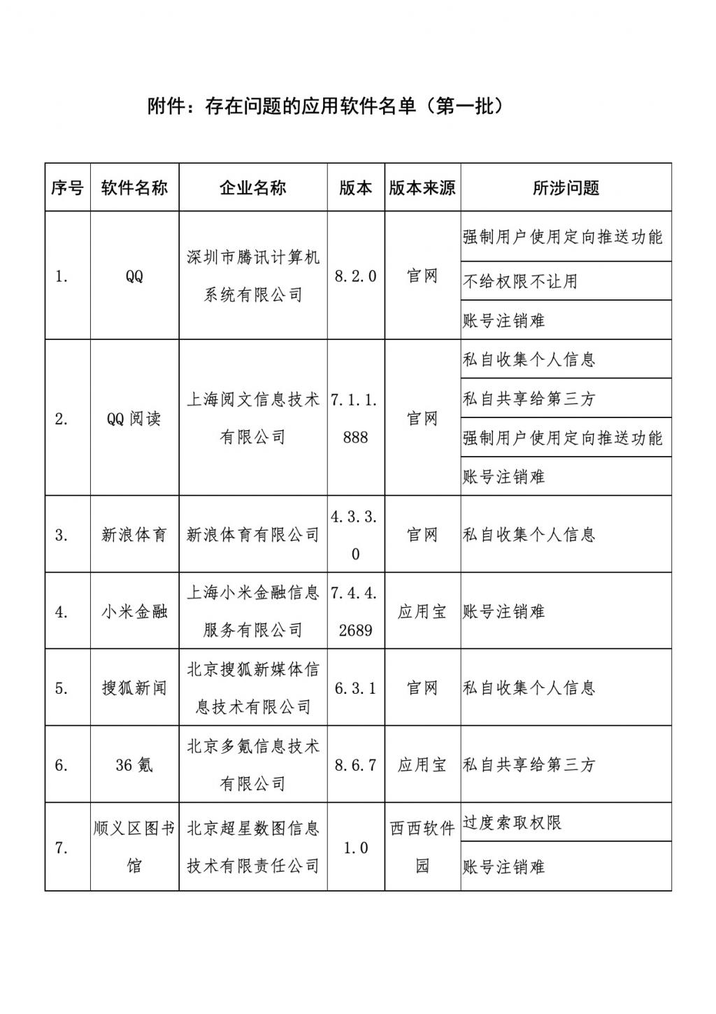 12 月 19 日,工信部发布《关于侵害用户权益行为的 APP(第一批)通报》,截至目前,尚有 41 款 APP 存在违规收集、使用用户个人信息、不合理索取用户权限、为用户账号注销设置障碍等问题,未完成整改。其中,腾讯 QQ、QQ 阅读、新浪体育、小米金融等在列。